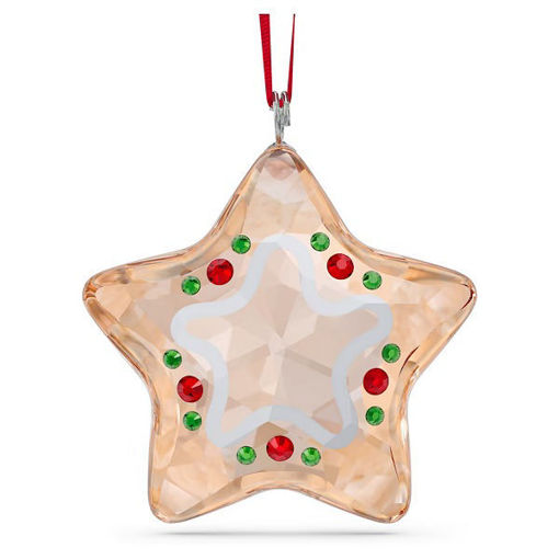 Designed to look like a gingerbread cookie, this star-shaped ornament shines with 354 facets of gold-toned crystal with white print detailing and red and green crystal accents. Hanging on a red grosgrain rayon ribbon, it will make a cute addition to your tree or a wonderful gift, especially when combined with the other pieces in the nostalgic Holiday Cheers collection. Decoration object. Not a toy. Not suitable for children under 15.