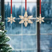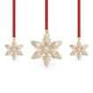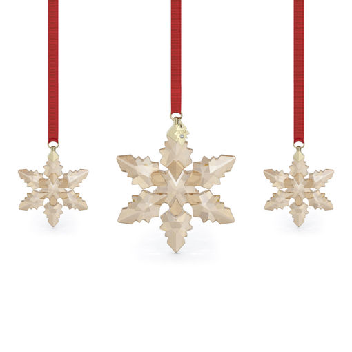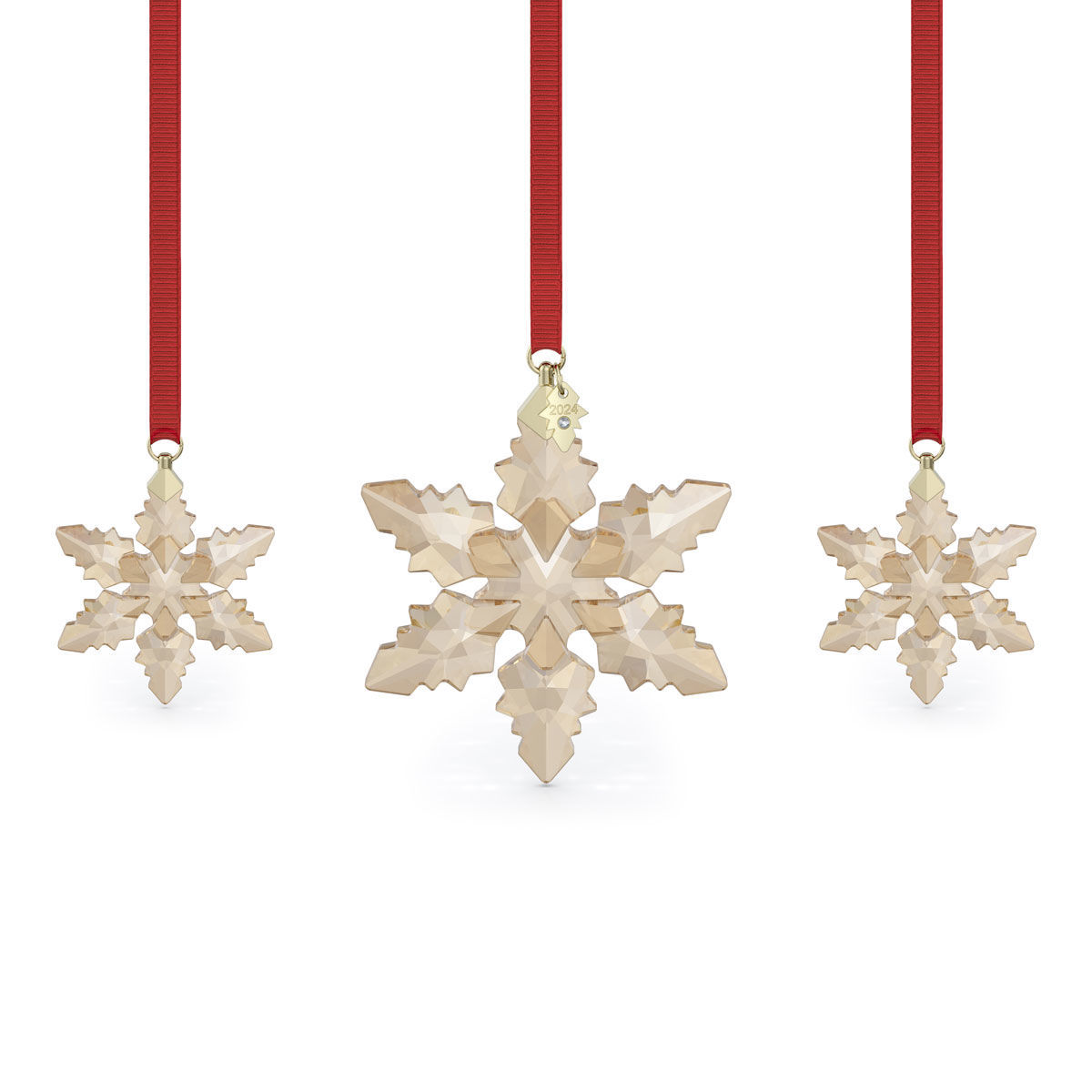 This glistening holiday set continues the beloved tradition of Swarovski's Annual Edition Ornaments. The trio of gold-tone pieces takes inspiration from the unique beauty of snowflakes, realized with Swarovski's unmistakable savoir-faire and mastery of precision. The set includes two smaller pieces and one large focal piece, showcasing 399 facets in total. Each snowflake is suspended from a red grosgrain ribbon with glossy champagne gold-tone accents, with the large star also featuring a tag engraved with "2024." Designed for the holiday season, this commemorative set would make a truly spectacular gift or brilliantly illuminate your own festive décor. Decoration object. Not a toy. Not suitable for children under 15.