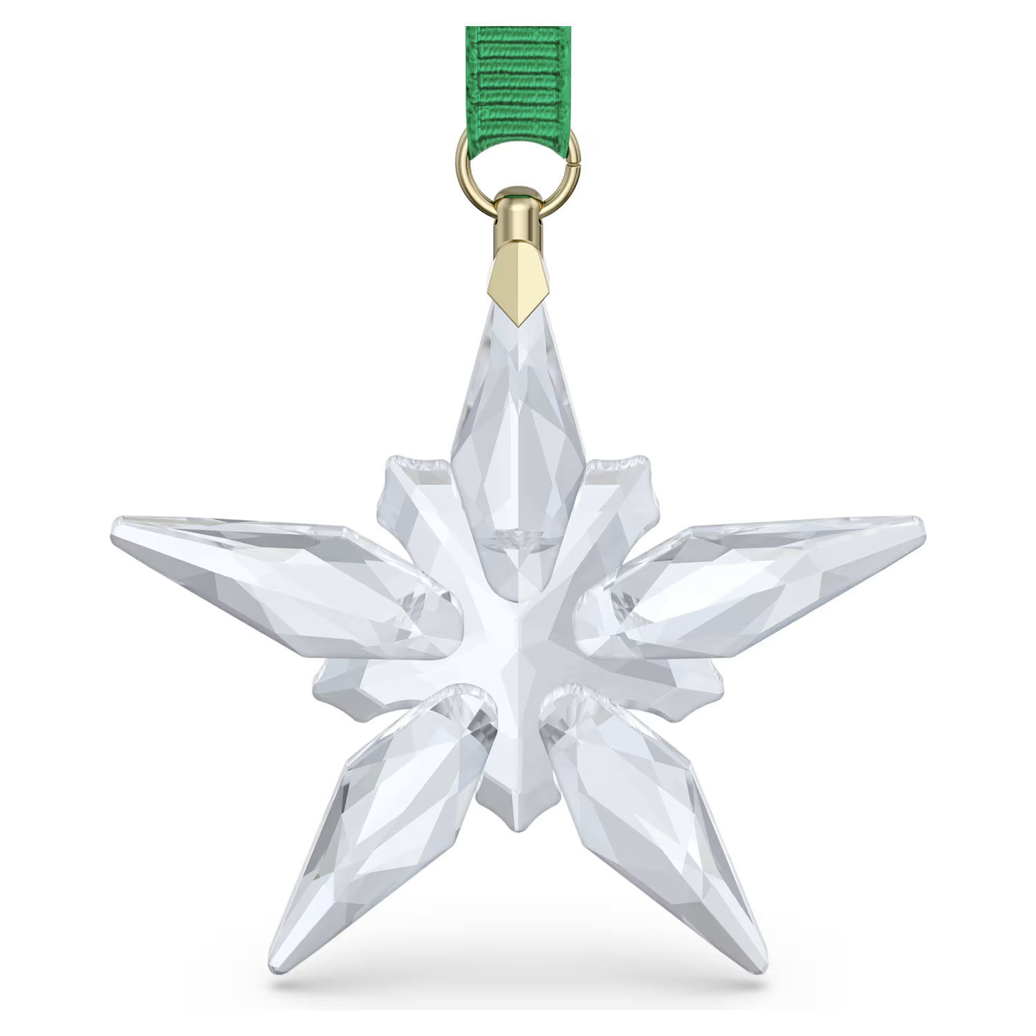 Embrace the wonders of the night sky with this Swarovski Annual Edition Little Star Ornament. Suspended from a green grosgrain ribbon with champagne gold-tone accents, the star-shaped design is precisely cut with 190 facets, beautifully embodying Swarovski’s complex simplicity and technical skill. Perfect for hanging on a festive tree, this delicate ornament provides endless light throughout the holiday season. Decoration object. Not a toy. Not suitable for children under 15.