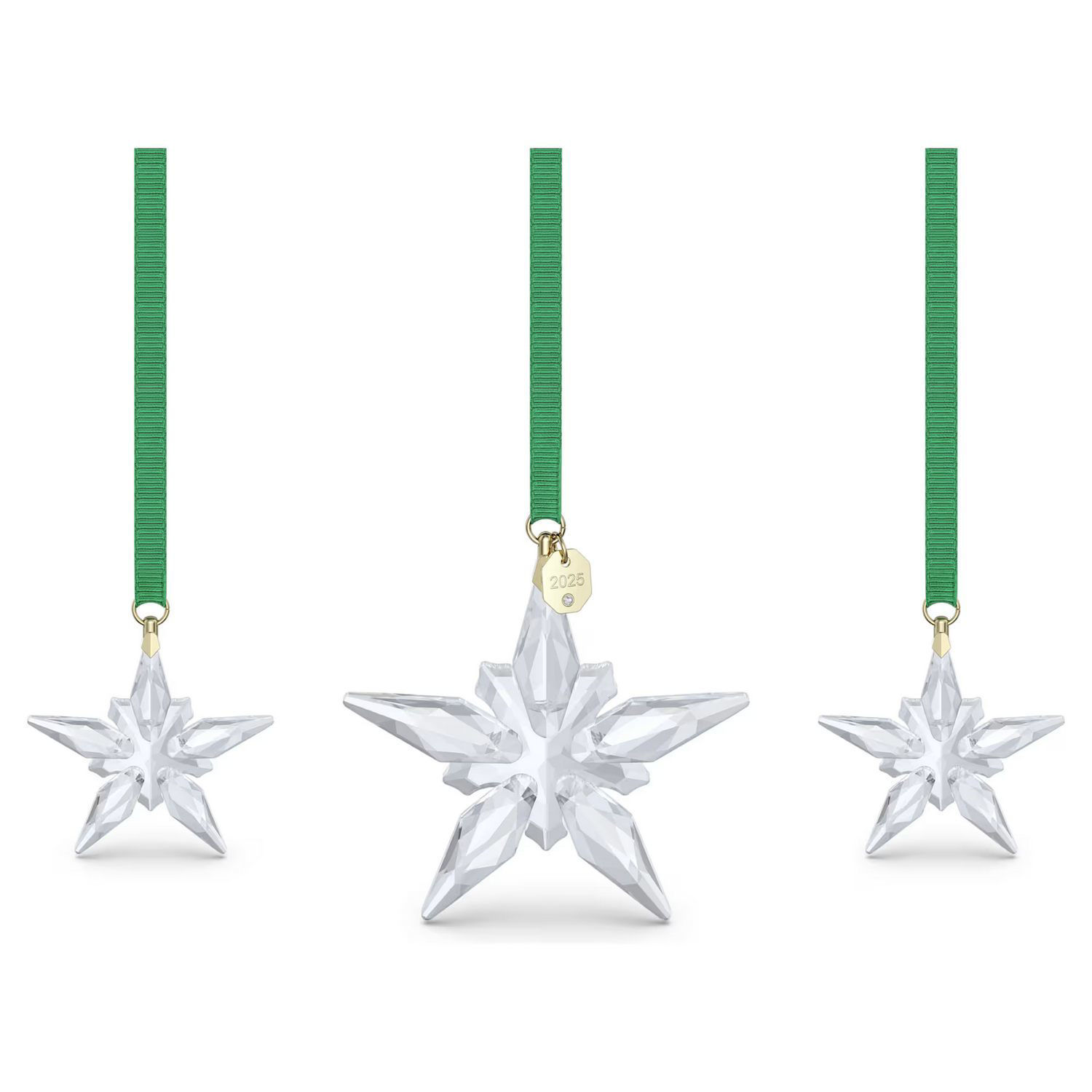 This magical holiday set continues the iconic tradition of Swarovski's Annual Edition Ornaments. The set features three clear stars, crafted with a total of 570 facets, that are inspired by the serenity of the night sky. Each star is suspended from a green grosgrain ribbon with champagne gold-tone plated accents, while the large star also includes a 2025 engraving on the tag. Designed especially for the holiday season, this commemorative set would make a truly elegant gift or take pride of place in your own festive décor. Decoration object. Not a toy. Not suitable for children under 15.