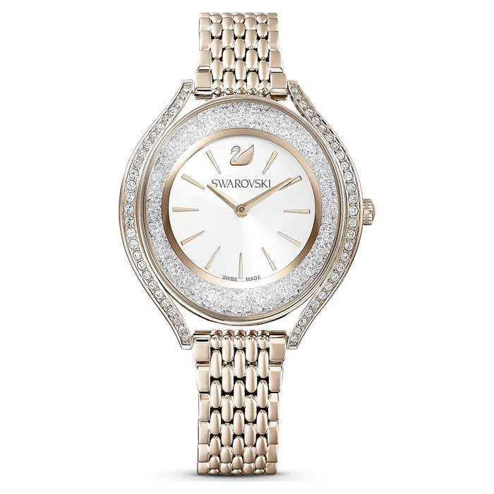 Eminently elegant: This Swarovski watch from our Crystalline Aura Collection artfully combines form and function. More than 1,300 crystals in the champagne-gold tone PVD case create a brilliant sparkling effect. A champagne-gold tone PVD bracelet and a white silver tone dial with the Swarovski swan at 12 o'clock complete the sophisticated design. This Swiss made watch is water resistant up to 50 m.