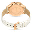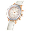 This ivory-colored chronograph watch delivers a perfect fusion of watchmaking expertise and Swarovski savoir-faire. The round 37mm case is made with a rose gold-tone finish and features a signature crystallized bezel, which is neatly faceted and accompanied by a circle of clear pavé. Beneath the mineral glass, the guilloché dial features a swan logo at 12 o’clock, LumiNova coated hands, and three chronograph counters for separate measurements of hours, minutes, and seconds. There are also six clear crystals used for the indexes and a single crystal placed in the watch’s crown. This Swiss made watch is water resistant to 50m and is worn on a quick-release Italian calfskin leather strap in ivory with an embossed crocodile pattern.