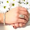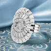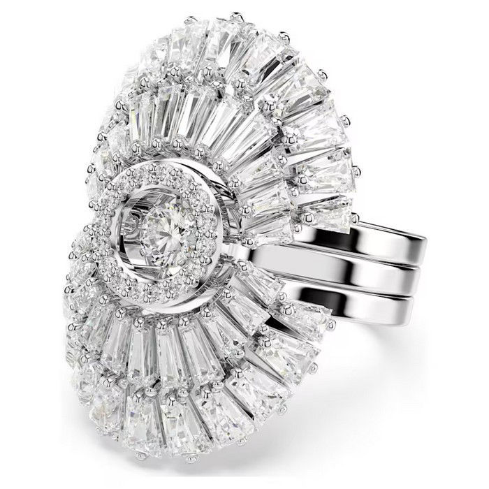 These stackable rings from the Hyperbola family are the perfect way to bring versatility into your style. Inspired by the beauty of the ocean, the rhodium-plated designs form a shell-like design, and can be worn individually or as a full set of three. The two outside rings feature a fan of clear Swarovski Zirconia, while the central ring is presented with a halo of small clear crystals and a radiant dancing crystal that catches the light. A statement set that will add instant impact to your look.