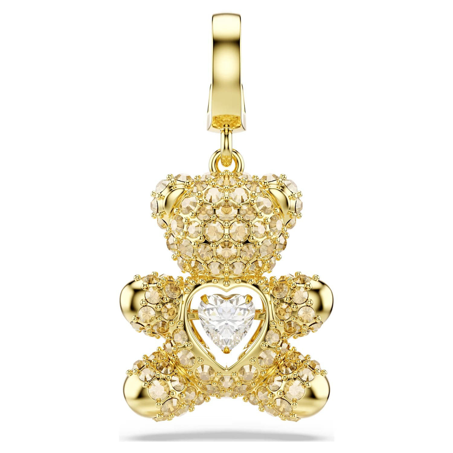 Adding a personal touch to your daily style, this gold-tone plated teddy charm is an ideal choice for those with a playful spirit. Decorated in crystals and with a radiant dancing stone at the center, the creation features a custom-designed clasp, allowing you to wear the charm on various necklaces and bracelets.