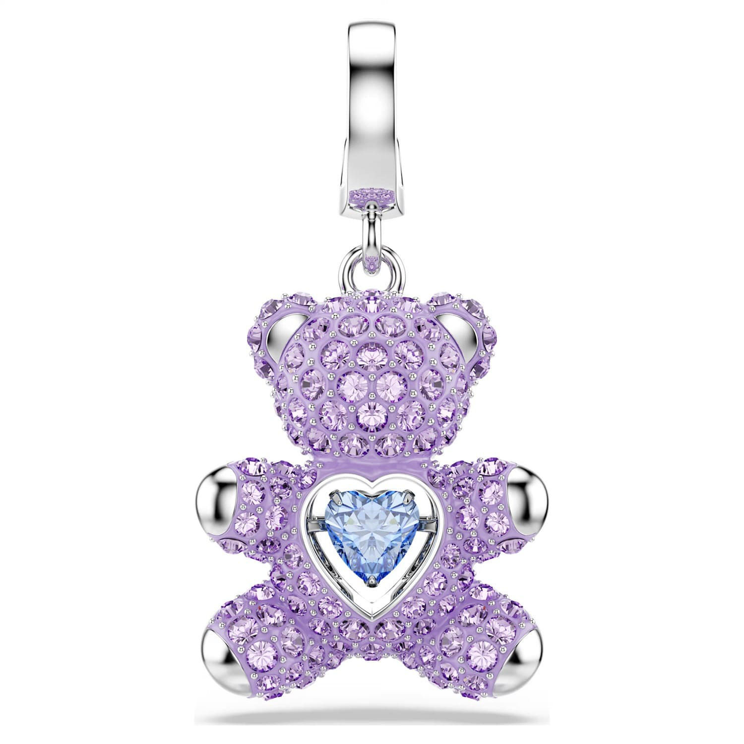 Adding a personal touch to your daily style, this rhodium plated teddy charm is an ideal choice for those with a playful spirit. Decorated in purple crystals and with a radiant blue dancing stone at the center, the creation features a custom-designed clasp, allowing you to wear the charm on various necklaces and bracelets.