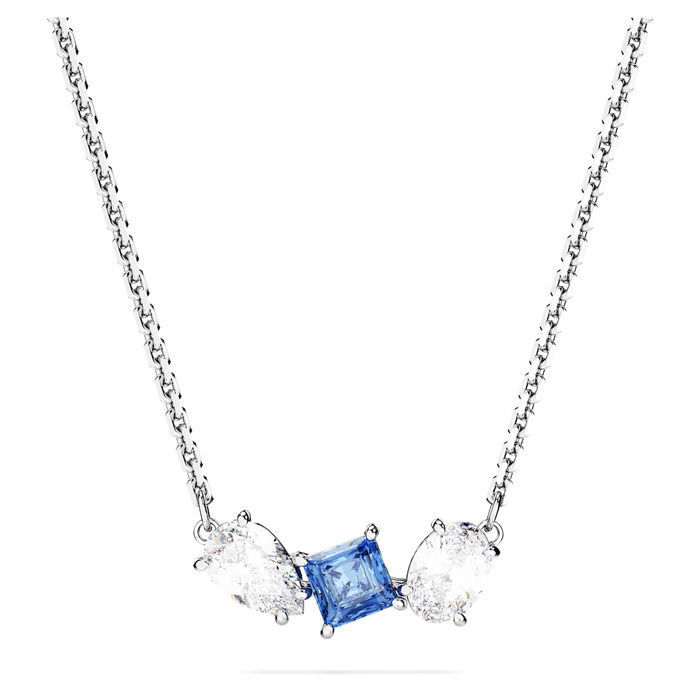 This elegant Mesmera pendant delivers exquisite refinement through its bold mix of cuts and color. Worn on a delicate chain, the rhodium plated design features a trio of prong-set Swarovski Zirconia in varying shapes with a radiant blue central stone. A wondrous gift that will accentuate any style.