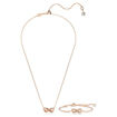 Layer your style with the eternal beauty of Swarovski’s Hyperbola jewelry. This rose gold-tone plated set features a pendant and bracelet, each designed with a timeless infinity symbol. The motifs are adorned with a pavé of clear crystals, while a single Swarovski Zirconia is placed in the elongation of each chain. A matching pair that offers an exquisite look of luxury.