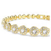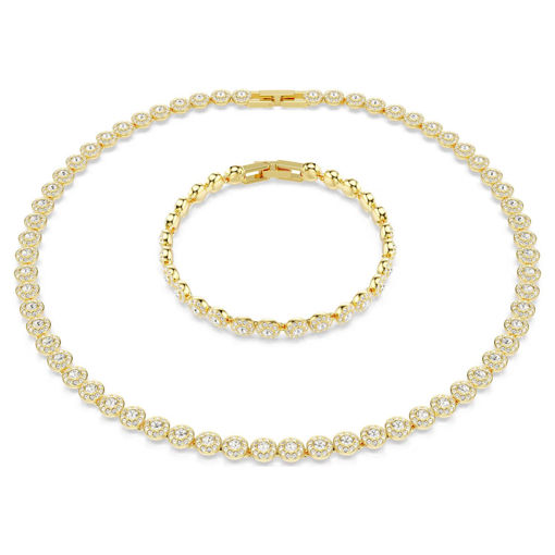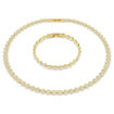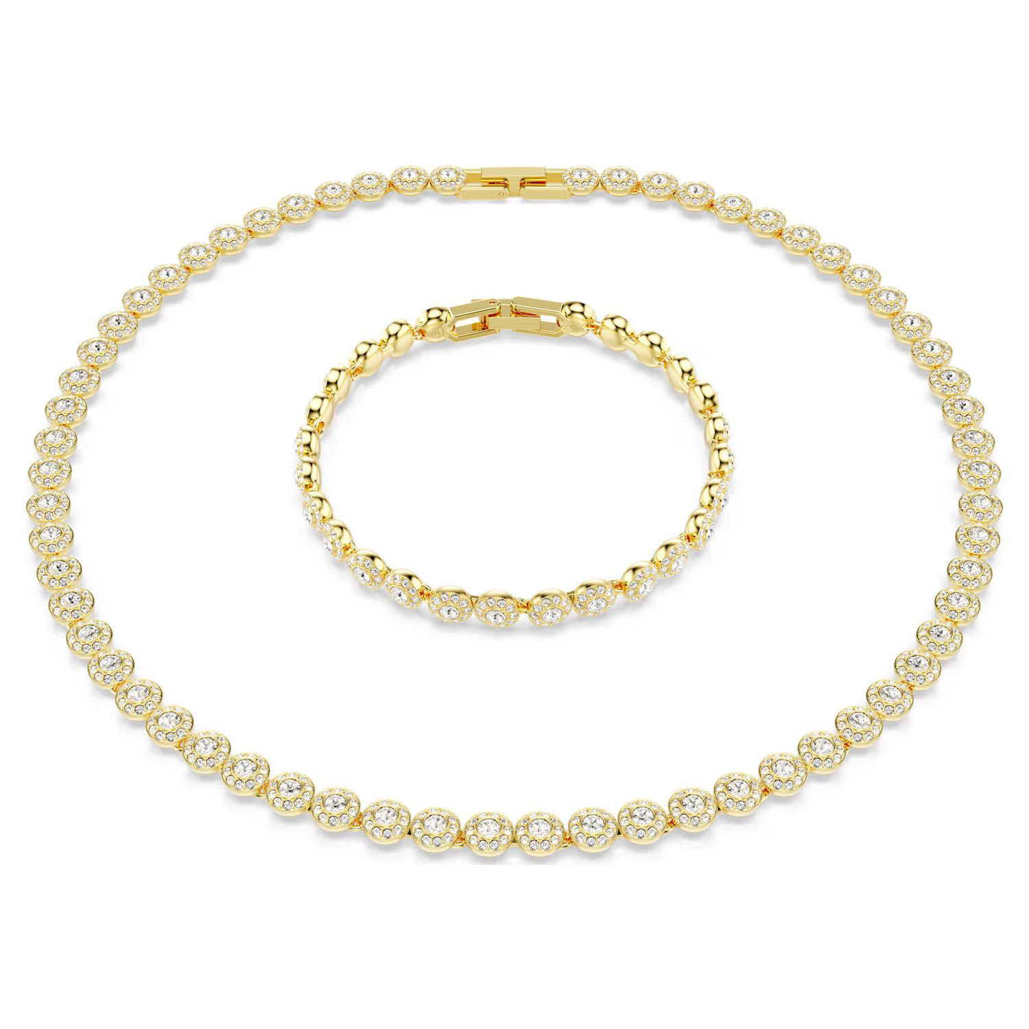 Harmonizing luxury throughout your style, this gold-tone plated set was born to shine. Each piece features a full surround of round-cut crystals, each framed by a halo of clear pavé. This includes the dainty motifs on both the necklace and the bracelet. The foldover clasps deliver a seamless closure, while the additional extenders mean you can adjust the jewelry for both comfort and size. Wear these pieces together whenever you need a look of all-over glamour.