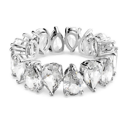 This ring by Swarovski showcases the sparkling beauty of gleaming, faceted stones. White, drop-shaped elements arrayed in a single row beautifully reflect and refract incoming light. Its puristic, elegant forms make this ring perfect for combination with other pieces of jewelry and trendy stacking looks with matching rings. An excellent choice to enhance an outfit for special occasions, and a truly inspired gift giving idea.