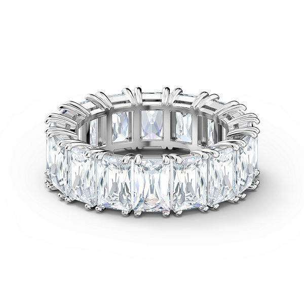 A striking, elegant look distinguishes this Swarovski ring. A row of gleaming white stones, cut into a faceted, rectangular shape, lends it an air of refined simplicity. The unbroken line of sparkling stones defines the character of the design and matches well with equally elegant pieces of jewelry, especially other rings to create an attractive and on-trend stacking look. A great match for special occasions, and an inspired gift giving idea.