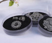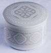 Tradisjon grå: Dette smykkeskrinet er blitt veldig populært hos de som ikke finner sin bunad hos oss, og hos de som ikke har bunad men som ønsker å oppbevare sine smykker uten at de blir svart etter kort tid. Skrinet finnes også med hvit dekor. Dekoren er utviklet av oss med utspring i norske tradisjonsmønstre. Det indre skrinet er lufttett og i tre etasjer. Sølvet holder seg blankt og fint i lang tid.
