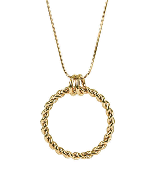 Långt halsband i Guldpläterat stål med hänge i form av en vriden ring. Blank finish.
